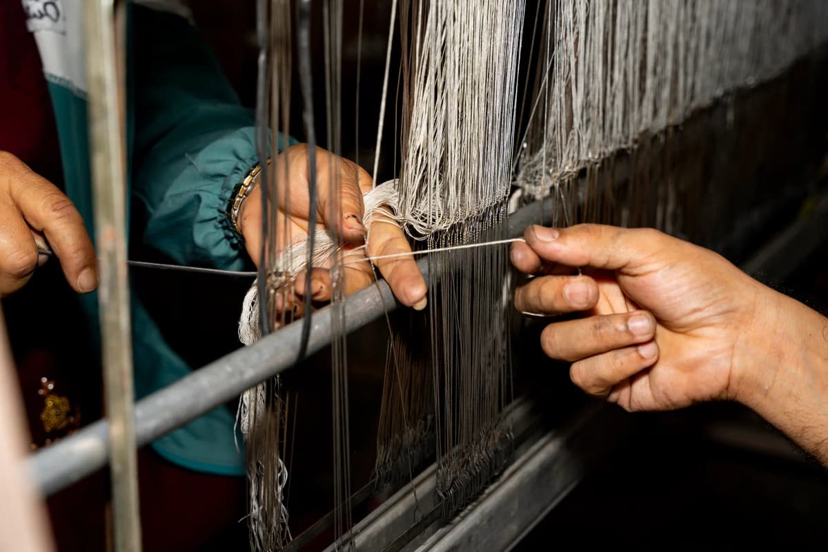 We use traditional handlooms that require the weaver to operate multiple parts: foot pedals that lift different sets of warp threads, a shuttle that carries the weft thread across, and a beater that packs each new row firmly against the last. This coordination takes skill and creates fabrics with subtle irregularities that machines cannot replicate.